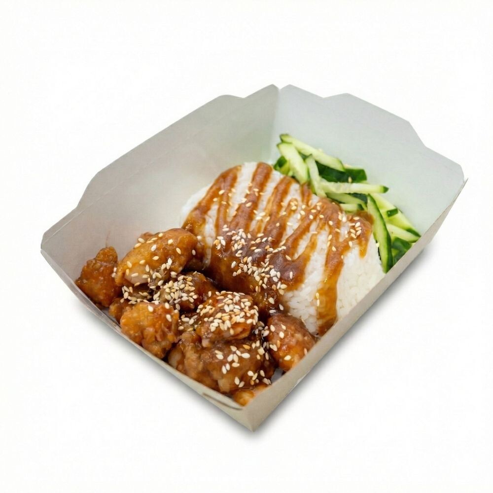Рис, нежное куриное филе, густой соус Терияки, свежие огурцы