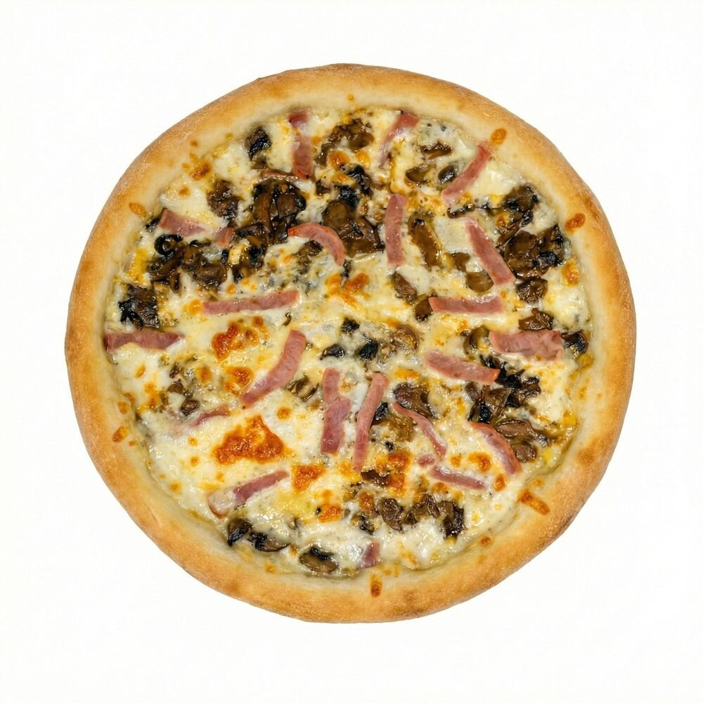 Тесто, соус Альфредо, сырный микс, ветчина, грибная начинка, чесночное масло