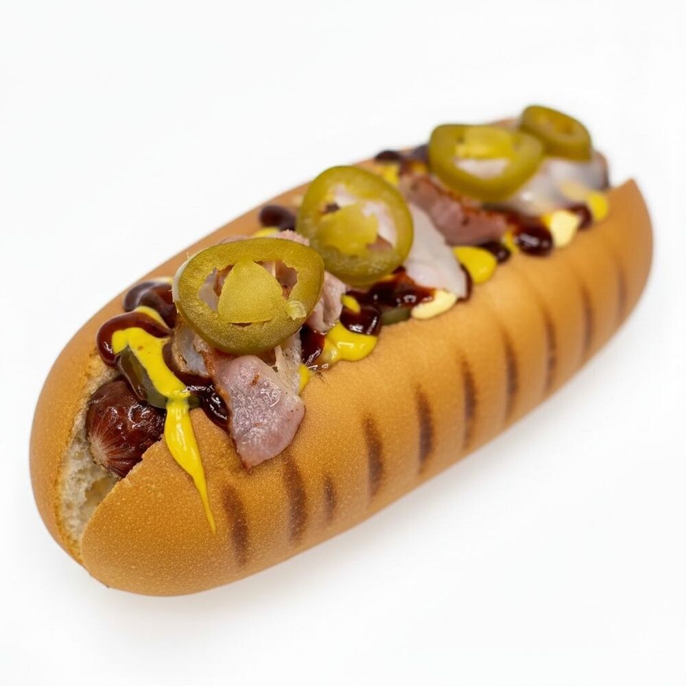 Булочка, охотничья колбаса, бекон, огурцы маринованные, халапеньо, соусы: Барбекю, Горчичный, Сырный