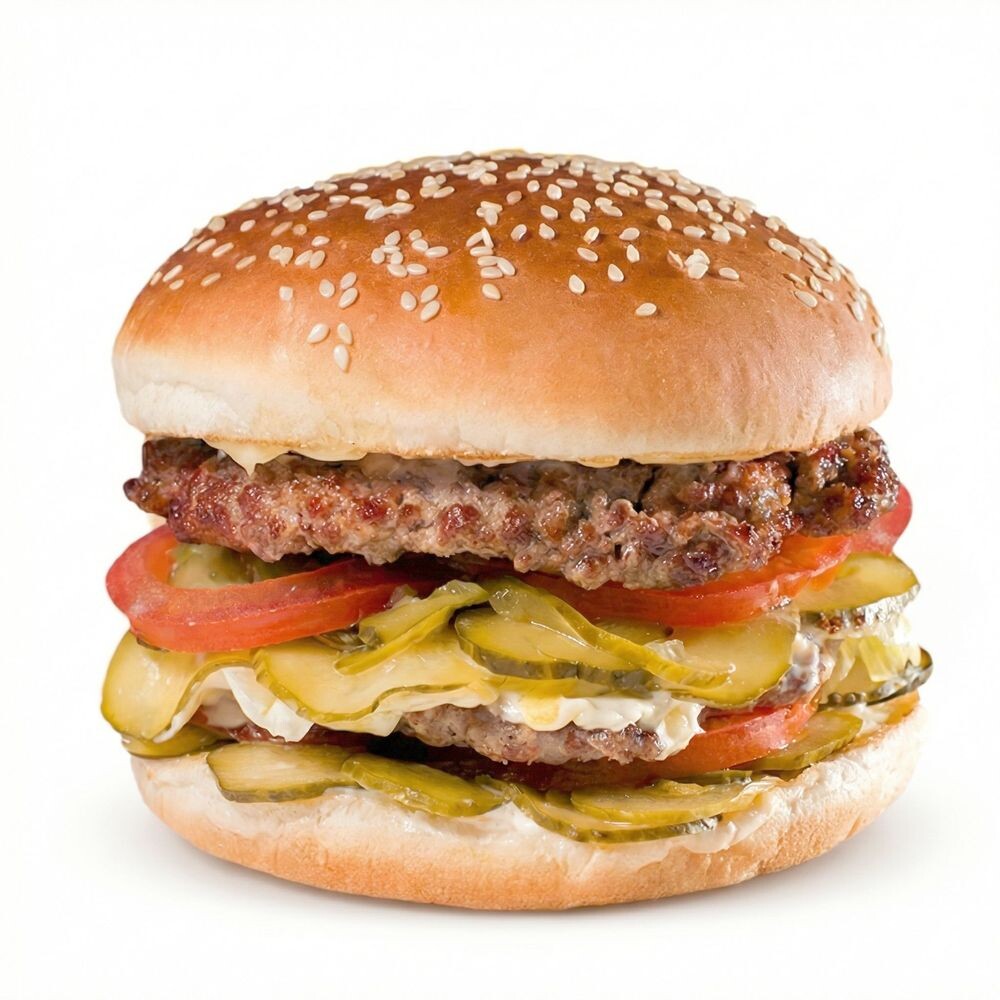 Булочка, две говяжьи котлеты, соус для говядины, маринованные огурцы, салат айсберг, помидор