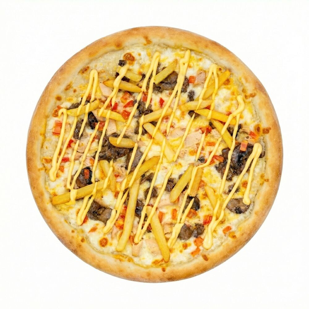 Тесто, соус Альфредо, сырный микс, курица су-вид, соус Сырный, картофель фри
