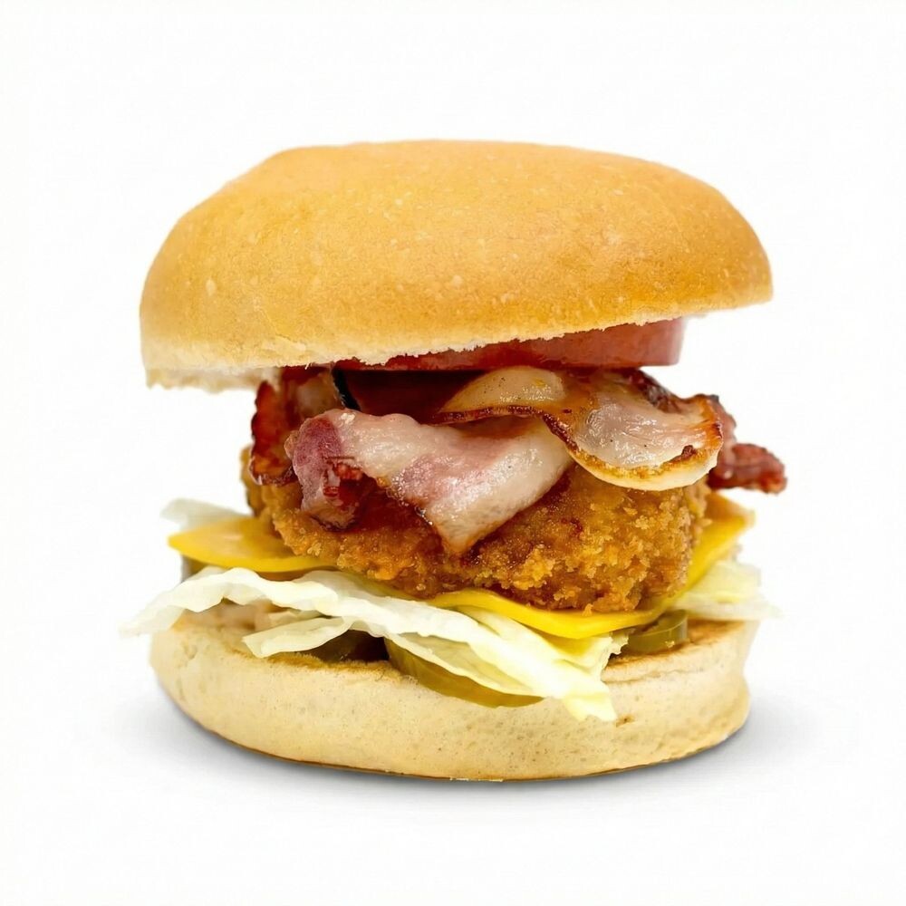 Булочка, курица жареная в панировке, сыр Чеддер, бекон, салат айсберг, халапеньо, помидор, соус барбекю, соус для говядины