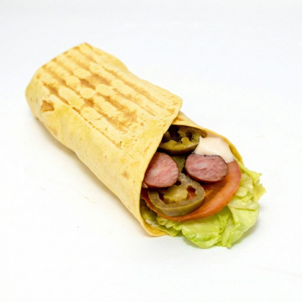 Тортилья, охотничья колбаса, салат Айсберг, помидор, огурцы марин., халапеньо, моцарелла, соус фирменный