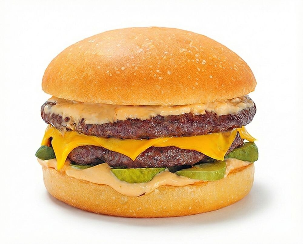 Булочка, две говяжьи котлеты, сыр Чеддер, соус для говядины, маринованные огурцы