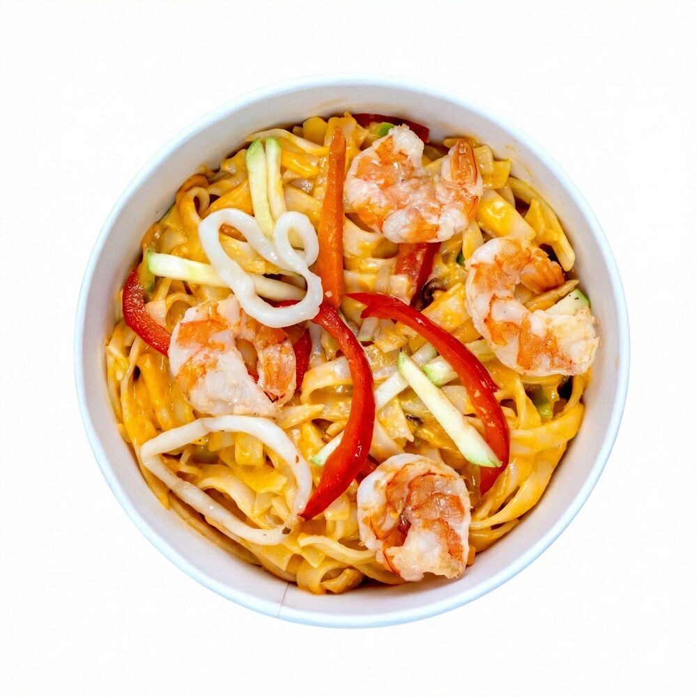 Лапша удон, креветка, кальмар, овощной микс, соус Том Ям, сливочный соус, помидор, кинза