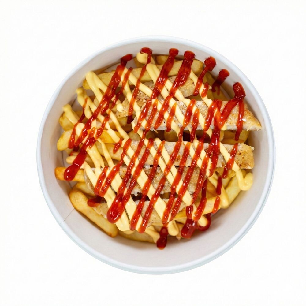 Курочка в золотистой панировке, картофель фри, кетчуп, сырный соус