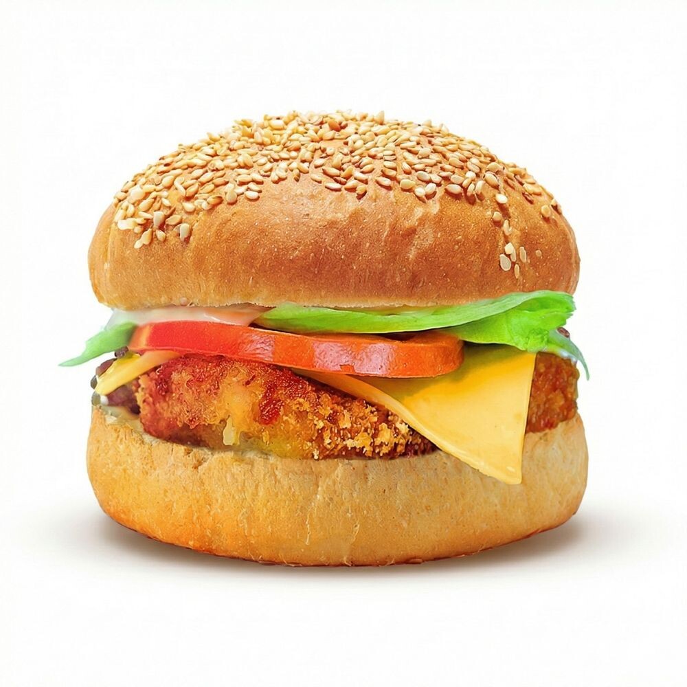 Булочка, курица жареная в панировке, сыр Чеддер, соус для курицы с ананасом, салат айсберг, помидор