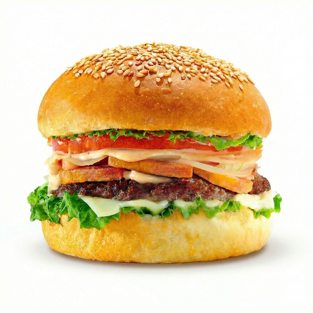 Булочка, говяжья котлета, сыр Чеддер, бекон, фирменный соус, лук репчатый, помидор, салат айсберг