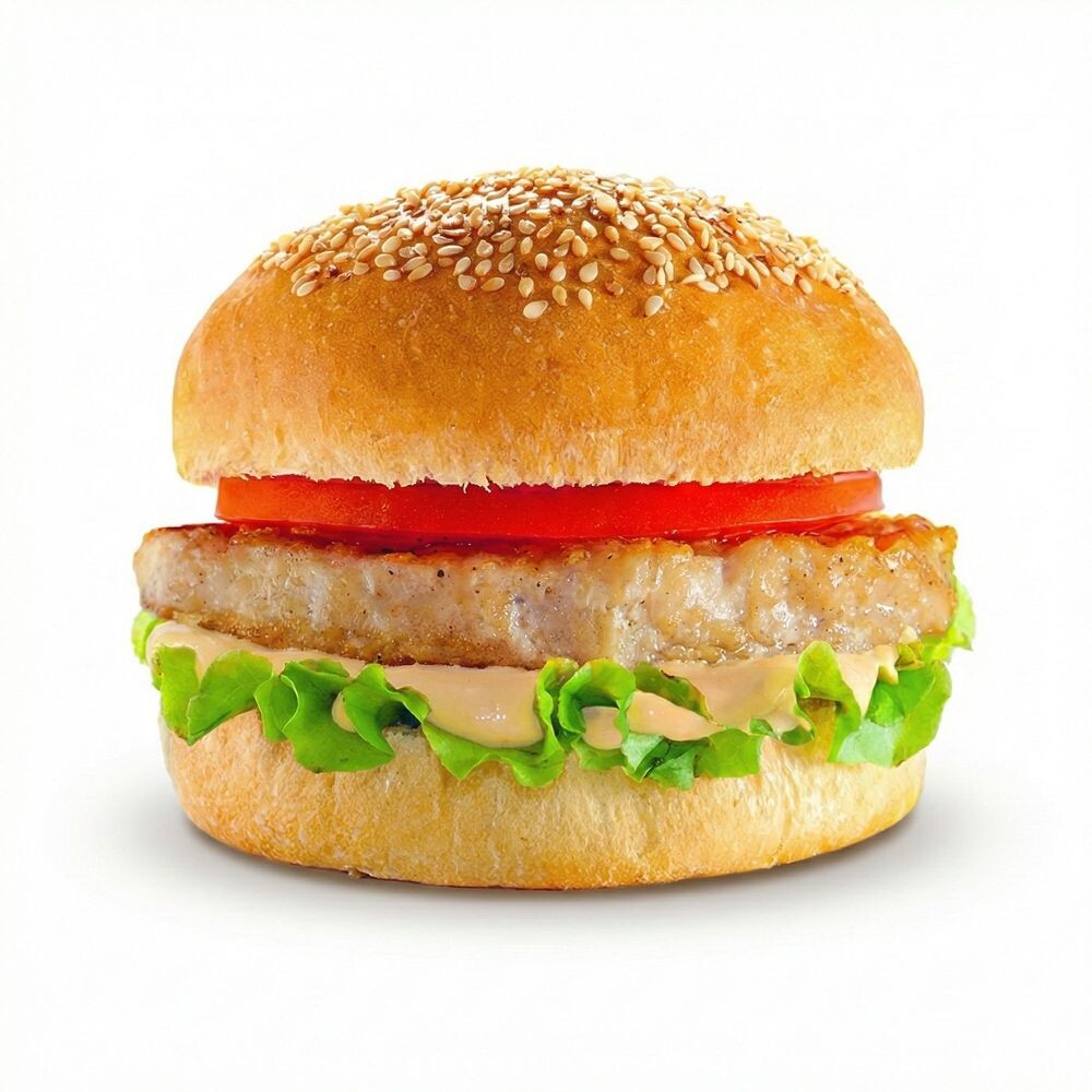 Булочка, куриная котлета, соус для курицы с ананасом, помидор, салат айсберг, маринованные огурцы