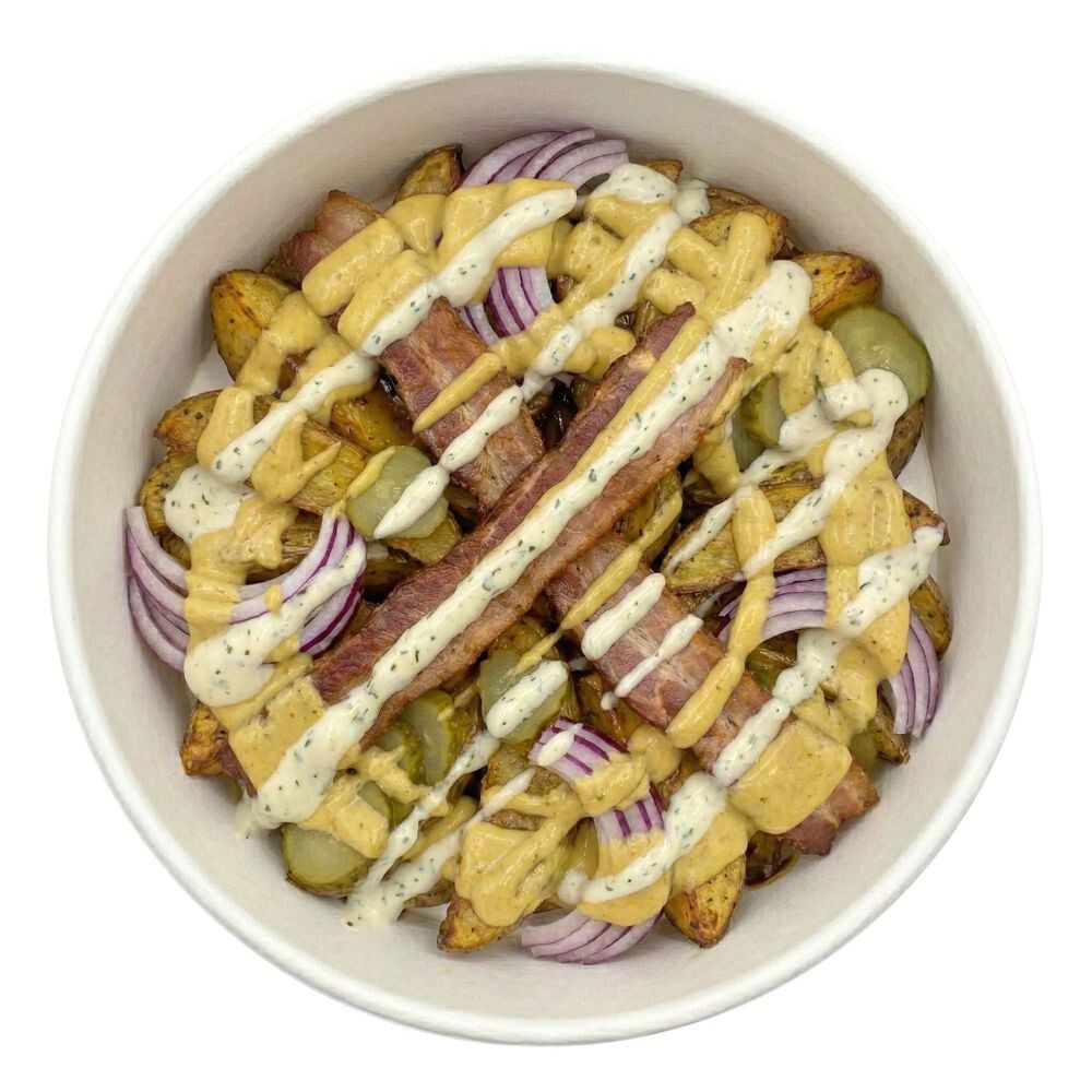 Картофель по-деревенски, обжаренный бекон, красный лук, соус фирменный, соус горчичный