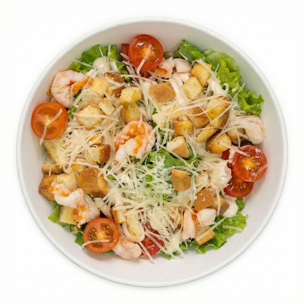 Листья салата Айсберг, томаты черри, тигровые креветки в золотистом кляре, сыр Пармезан, хрустящие сухарики, фирменный соус Цезарь