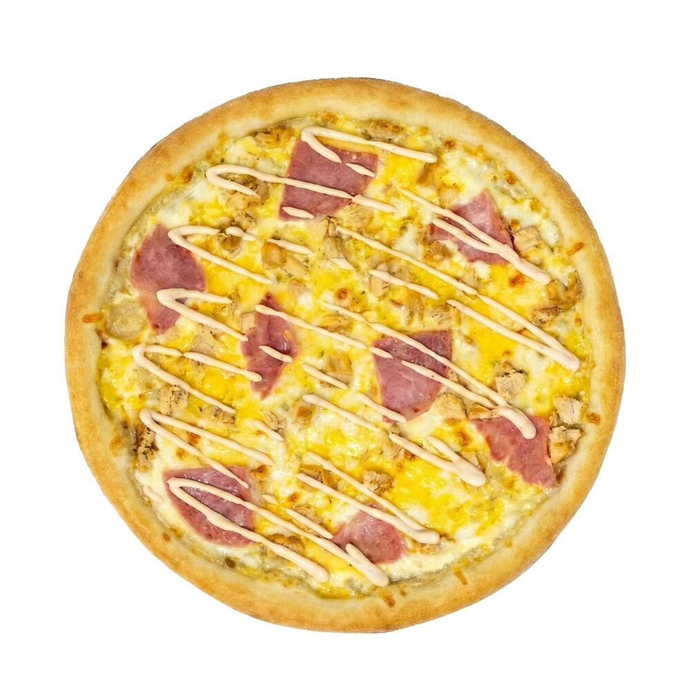 Тесто, соус Альфредо, сырный микс, куриное филе, ветчина, фирменный соус