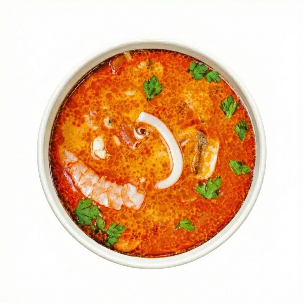 Бульон Том-Ям, тигровые креветки, кальмар, томаты черри, отварной рис