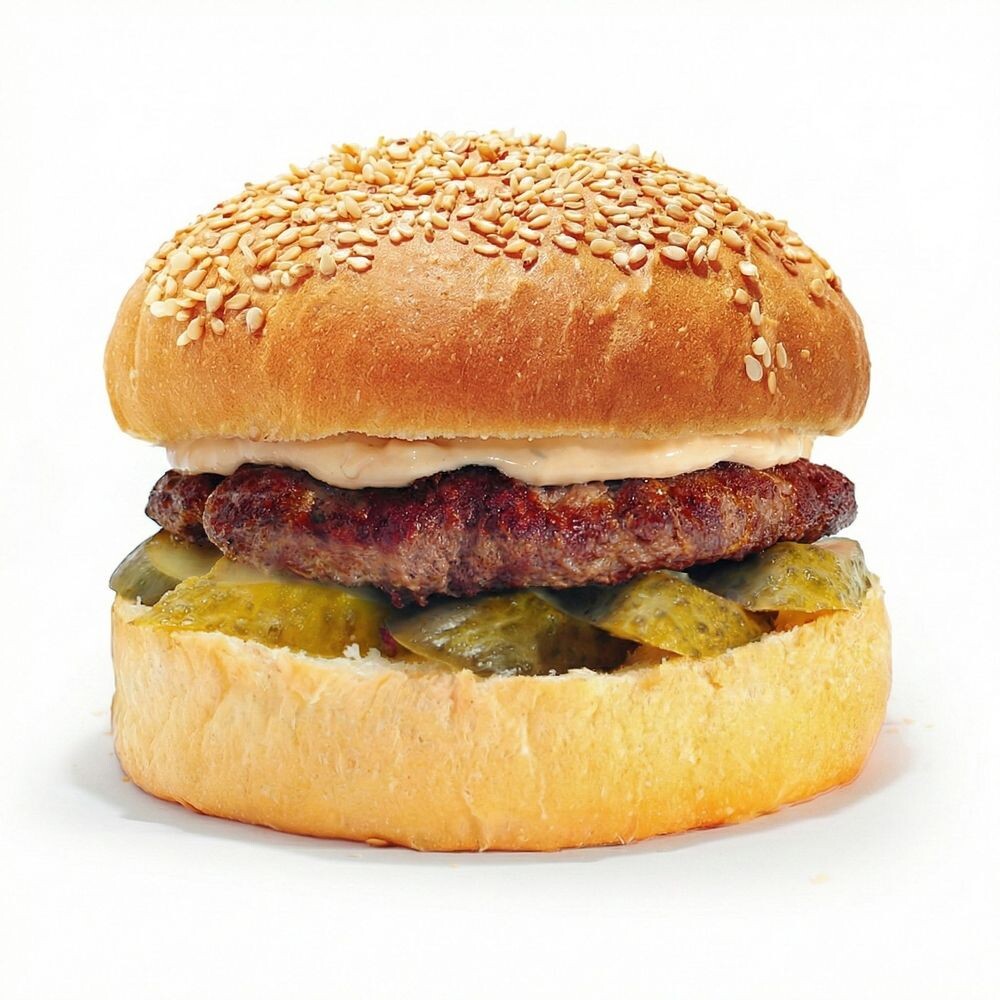 Булочка, говяжья котлета, соус для говядины,маринованные огурцы