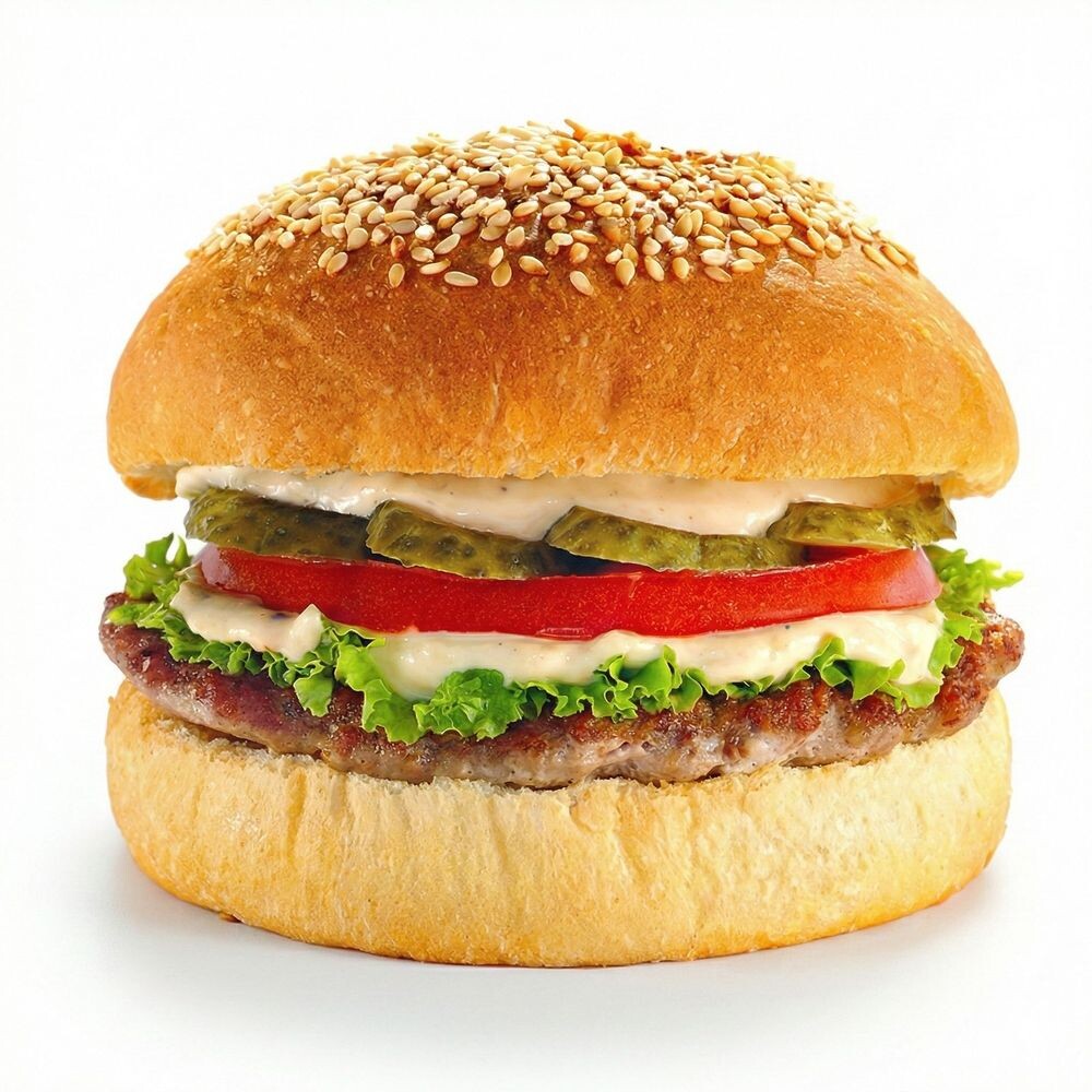 Булочка, куриная котлета, соус для говядины, маринованные огурцы, помидор, салат айсберг